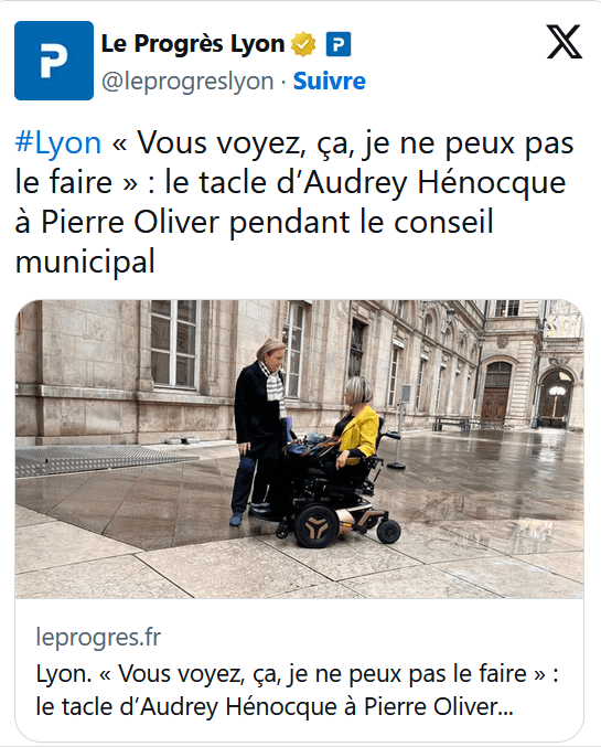 👩🦽 Une délibération a particulièrement fait réagir à ce Conseil : celle concernant l’achat d’un local près de l’Hôtel de Ville, qui accueillera prochainement les différents groupes politiques. Pourquoi ce déménagement ? La Ville est à la recherche de nouveaux bureaux depuis 4 ans : les locaux actuels ne sont pas accessibles aux personnes à mobilité réduite. Audrey Hénocque, 1ère adjointe à la Ville de Lyon, publiait en 2022 une tribune sur les moyens à déployer pour permettre aux personnes en situation de handicap de participer à la vie politique, évoquant en autre cette difficulté d’accessibilité.