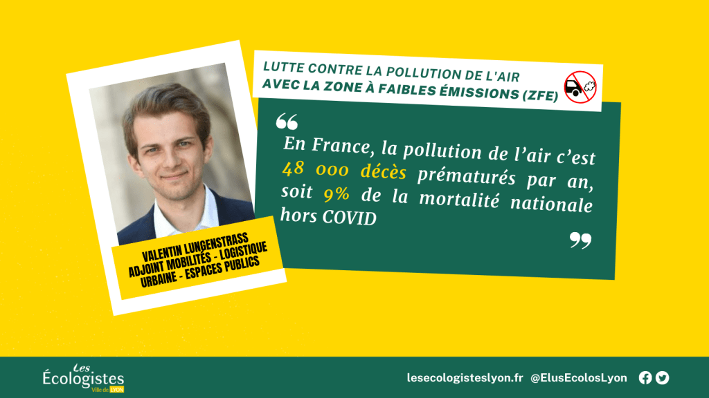 Ce jeudi 10 février, les membres du Conseil municipal de Lyon étaient réunis pour donner leur avis sur la première étape d’amplification de la Zone à faibles émissions (ZFE) qui doit être mise en place par la Métropole de Lyon cette année. La ZFE doit permettre de limiter la pollution de l’air qui entraîne des allergies respiratoires et des pathologies cardio-vasculaires, surtout chez les personnes les plus fragiles (enfants, personnes de plus de 65 ans, femmes enceintes). En France, la toxicité de l’air engendre 48 000 décès prématurés par an, soit 9% de la mortalité nationale (hors COVID). Dans notre métropole, 2 000 morts par an y sont liées. Les populations les plus précaires, qui habitent davantage à proximité des grands axes de circulation, sont les plus exposées.