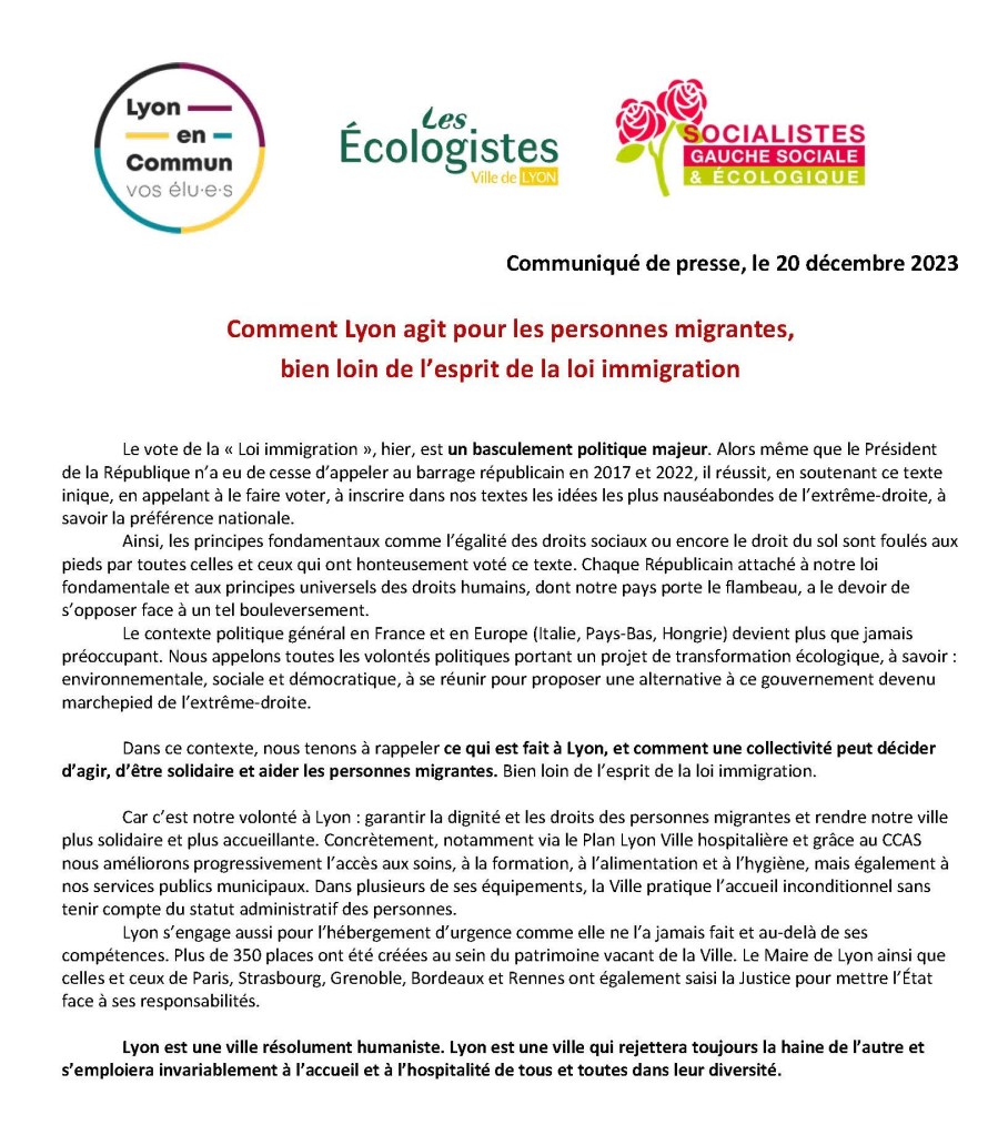 👀 Juste avant le Conseil municipal, un communiqué de presse faisant suite au vote de la loi Immigration a été publié par les 3 groupes de la majorité, pour dénoncer ce texte et rappeler qu’à Lyon, de nombreuses actions sont engagées pour les personnes migrantes.