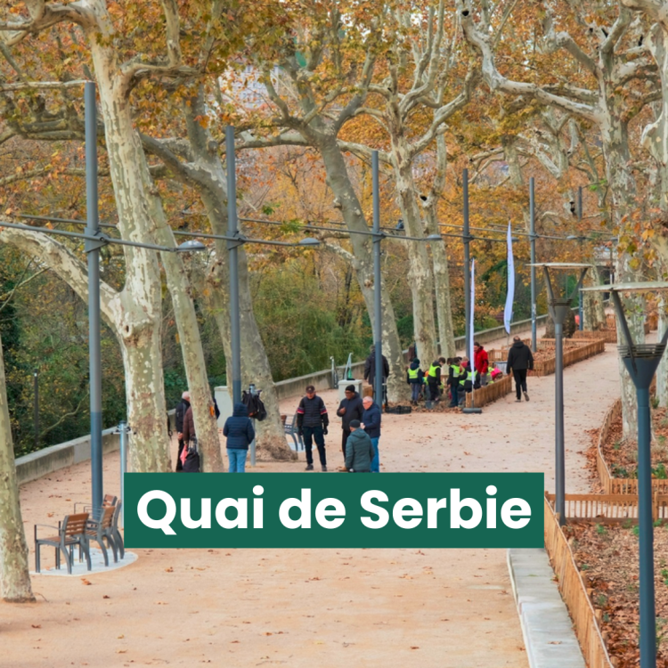 Nouvelle étape dans la végétalisation de la partie haute des quais du Rhône : en plus de l’élargissement de la Voie Lyonnaise il y a quelques mois, le cheminement piéton sous les platanes historiques se voit doté d’une magnifique strate basse de végétalisation en devenir. Permettant de rafraîchir vos balades et même de les interrompre pour s’installer sur les nouveaux bancs en contemplant le paysage, cette opération contribue à mieux accueillir la biodiversité et rendre nos espaces publics plus perméables aux grandes pluies !