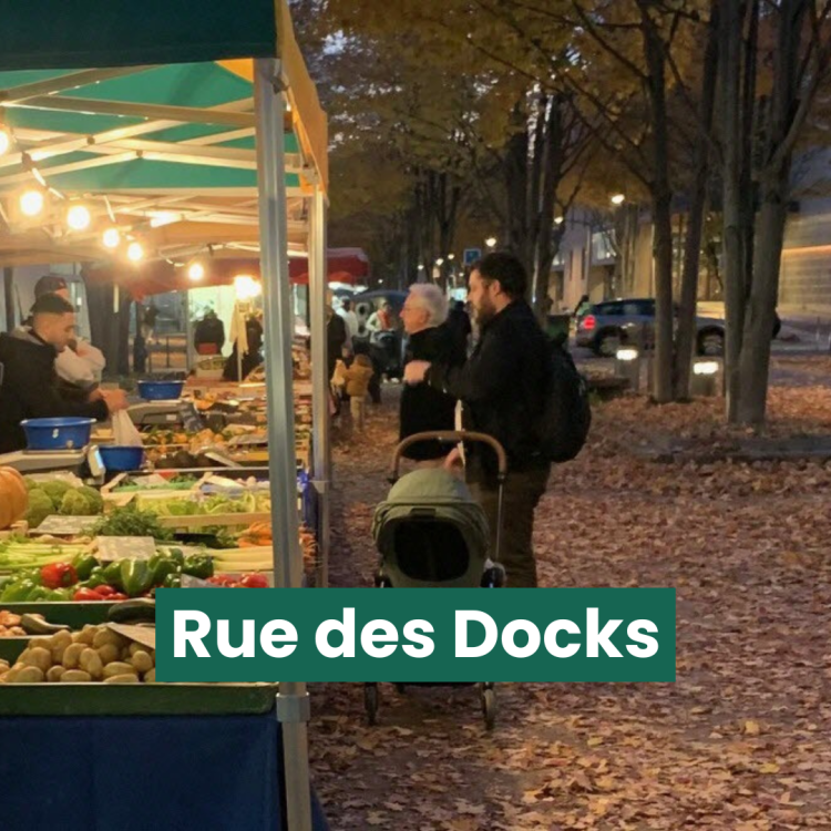 C’est parti pour un an d’expérimentation! Tous les jeudis de 14h à 20h, un marché alimentaire en plein air a lieu rue des Docks dans le quartier de l’Industrie (9e). Une réponse aux demandes des habitants et qui valorise le lien ville-campagne, une alimentation de qualité, le lien social et intergénérationnel !