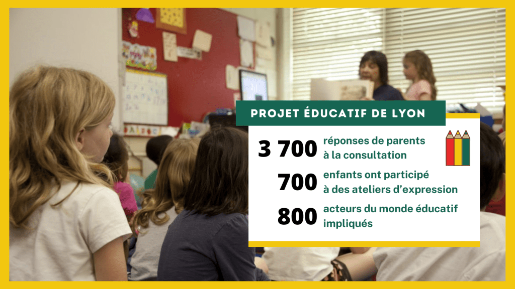 L’Ă©laboration de ce projet a impliquĂ© toutes les parties prenantes, et donnĂ© lieu Ă une très large consultation, avec plusieurs milliers de personnes qui ont pu donner leur avis. Ce projet a Ă©tĂ© mis en Ĺ“uvre avec les partenaires de la majoritĂ©, socialistes et de Lyon en commun, avec une forte implication de StĂ©phanie LĂ©ger, adjointe Ă l’Ă©ducation et Tristan Debray, conseiller dĂ©lĂ©guĂ© Ă la ville des enfants.